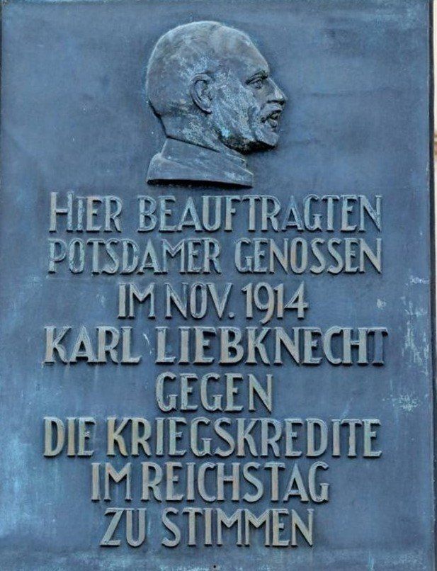 Diese Gedenktafel ehrt nicht nur Karl Liebknechts Verurteilung der Kriegskredite zu Beginn des Ersten Weltkriegs, sondern verdeutlicht auch, dass er von mehreren Potsdamer Genossen in seinem Protest gegen die Beteiligung Deutschlands an diesem unsäglichen Krieg unterstützt wurde.