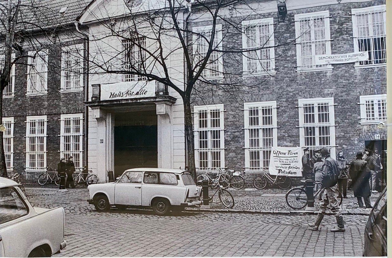 In diesem Gebäude, das nun das „Haus der Demokratie“ war, unterhielt die SPD ihr erstes offizielles Quartier in Potsdam für die Vorstände der Verbände von Bezirk Potsdam, Potsdam Stadt und Potsdam-Land, später auch für den Landesvorstand vom Februar bis August 1990. Außer der SPD waren das „Neue Forum“, die Organisation „Argus“, welche es sich zur Aufgabe gemacht hatte, die Vernichtung von belastendem Material über die Aktivitäten der Stasi zu verhindern, und weitere Gruppierungen eingezogen. Trotz der vorhandenen Unterschiede war der gemeinsame Weg „zur Sonne und zur Freiheit“ vorgezeichnet. (Christel Dettmann)